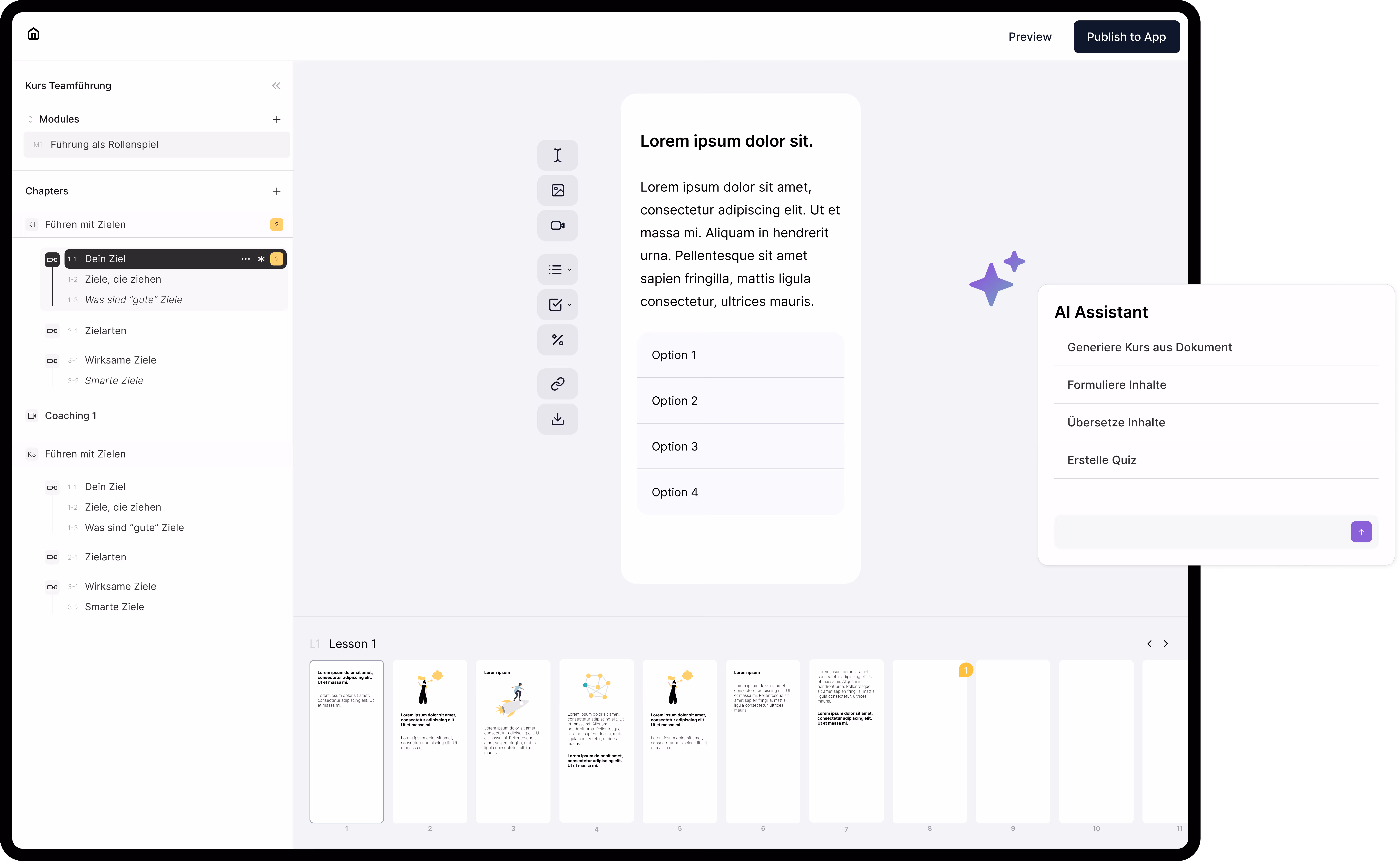 Create courses, organize knowledge and simply provide it to your teams and employees in a matter of seconds — quickly, easily, and AI-supported,